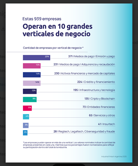 - 10 verticales de negocio: los segmentos de medios de pago (emisión, adquirencia y recaudación) y activos financieros con los principales verticales de negocio, seguidos de las empresas dedicadas al crédito, la provisión de infraestructura, de cripto y b