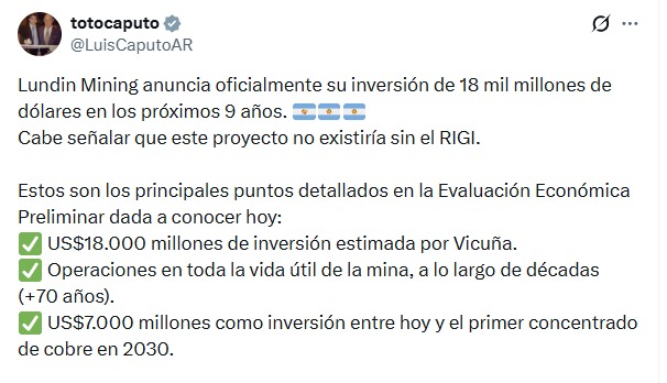 Según destacó Luis Caputo en sus redes sociales, esta iniciativa, que se extenderá a lo largo de nueve años, “no existiría sin el RIGI” (Régimen de Incentivo para Grandes Inversiones), la herramienta legal sancionada por el gobierno de Javier Milei para fomentar los desembolsos de magnitud.